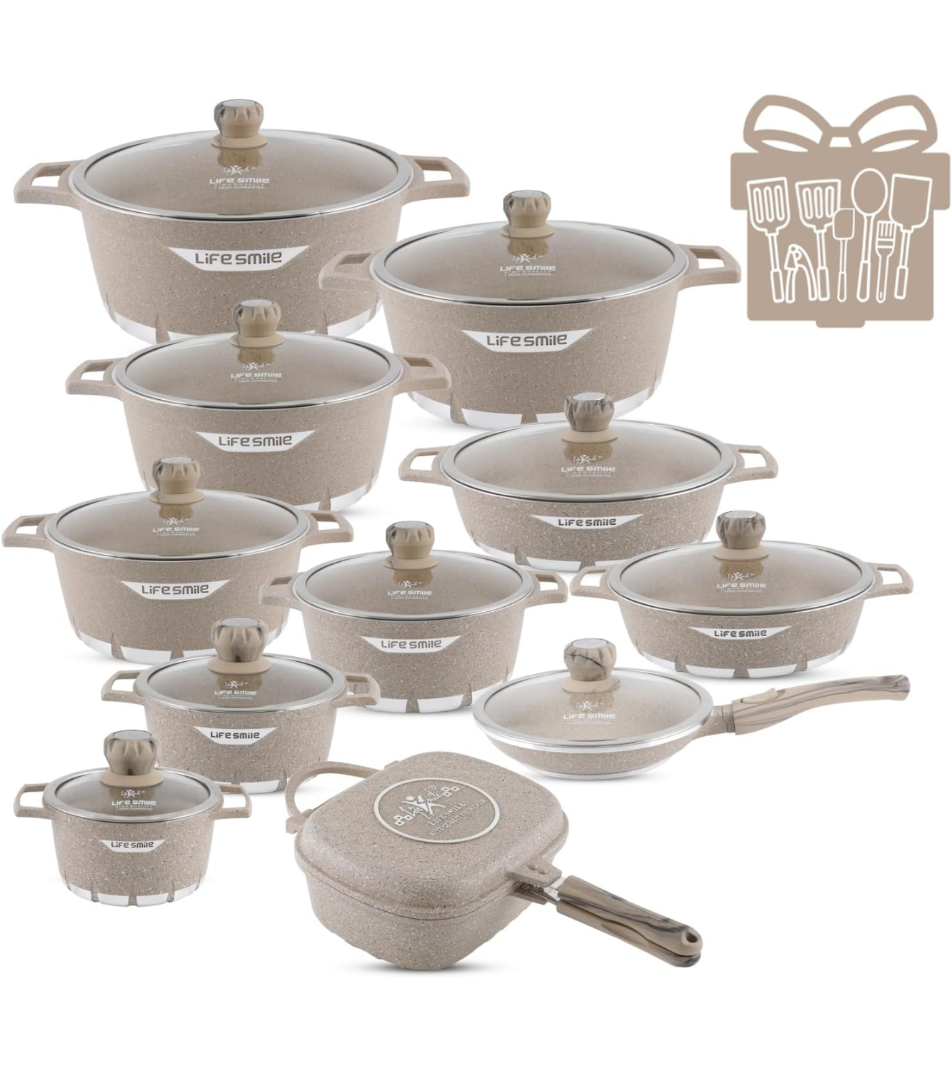 LIFE SMILE Conjunto de Panelas Granito Stone - 29 Peças, Revestimento Antiaderente Multi Camadas, 100% Livre de PFOA, Compatível com Todos os Fogões (Bege)